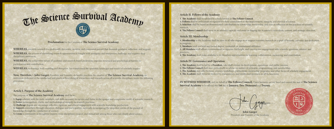 Now, Therefore, I, John Garger, President and Founder, do hereby proclaim the creation of The Science Survival Academy, an institution dedicated to the intellectual and practical flourishing of researchers and research across all scientific disciplines, under the following provisions:
